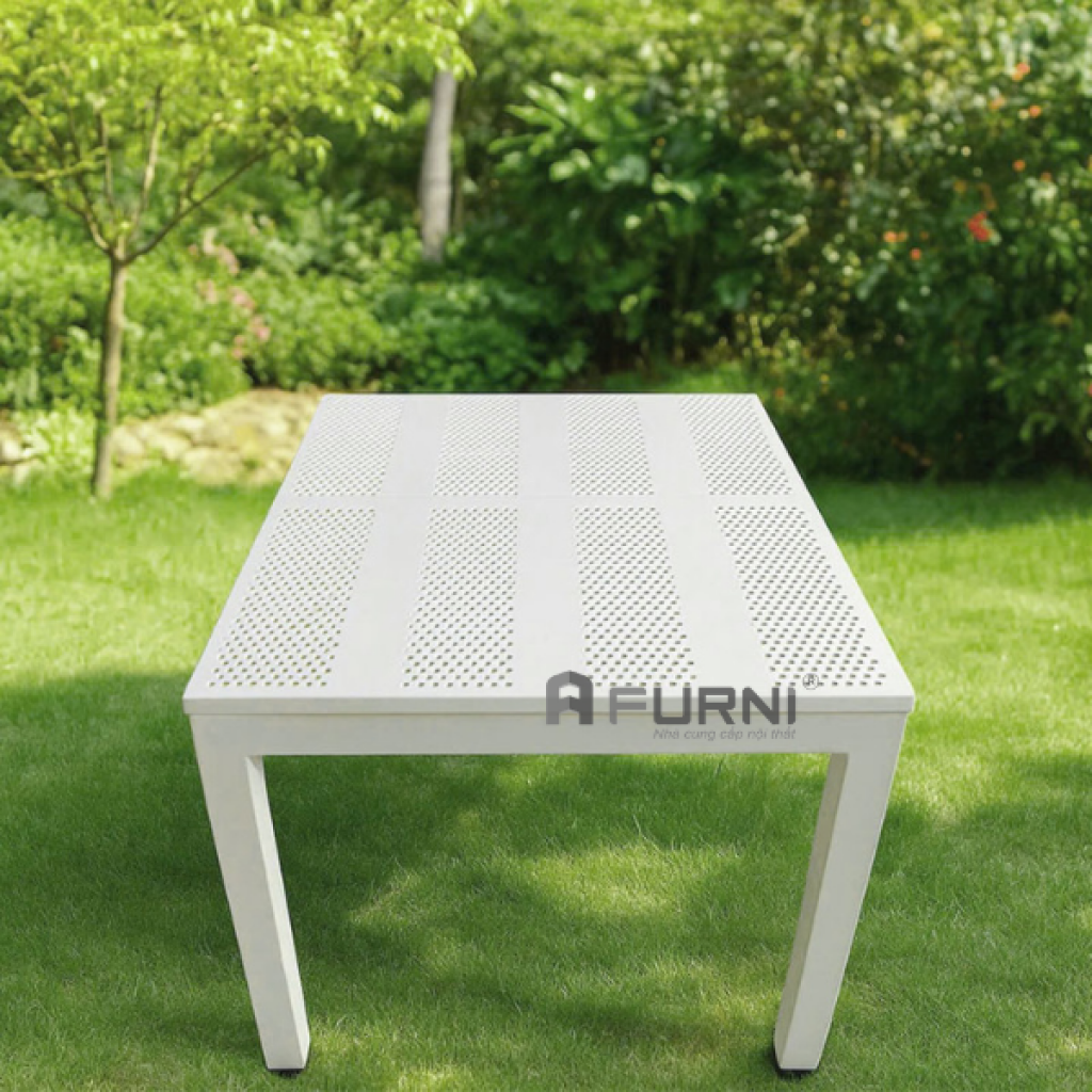 Thiết kế theo phong cách bàn tiệc khung trắng mang đến vẻ ngoài sáng sủa, hiện đại và dễ dàng kết hợp với nhiều loại ghế ngoài trời khác nhau. Gam màu trắng giúp không gian trở nên rộng rãi, thoáng đãng và chuyên nghiệp hơn.
