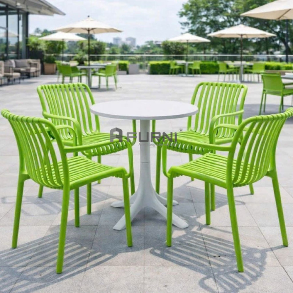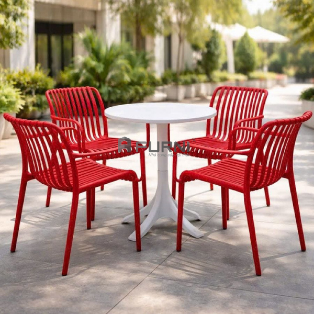 Ghế nhựa đúc phù hợp cả không gian trong nhà và ngoài trời có mái che, giúp quán cafe hoặc khu vực tiếp khách luôn trẻ trung, năng động.