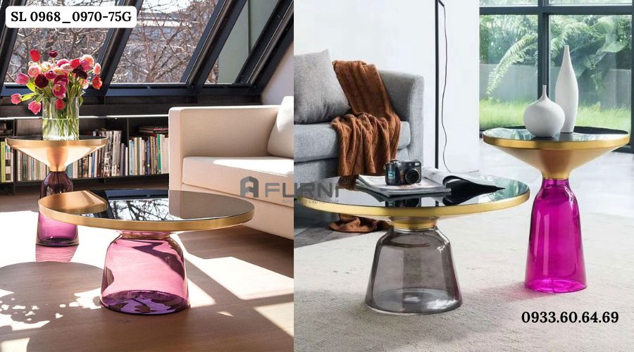Bộ đôi SL 0968_0970-75G rất thích hợp để ghép với những bộ ghế sofa có tông màu trung tính. Mặt bàn kính cường lực màu đen dày dặn có viền inox vàng sang trọng.
