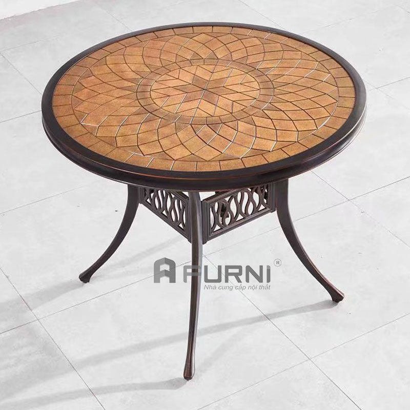 Chất liệu: Mặt bàn gỗ nhựa Polywood màu nâu. Khung bàn hợp kim nhôm sơn tĩnh điện màu đen.