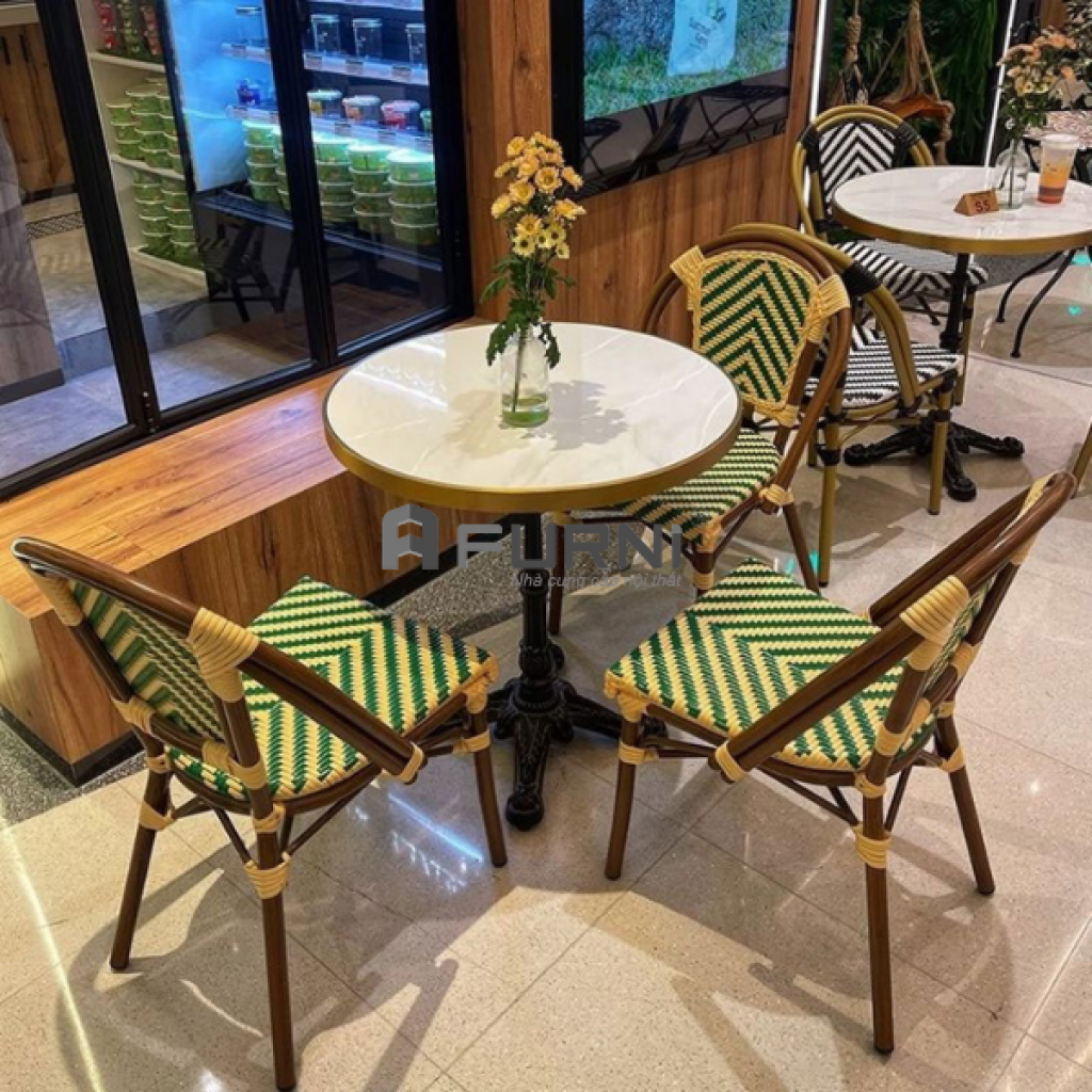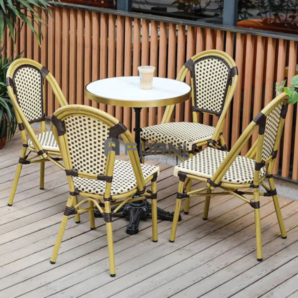 Không chỉ nổi bật bởi vẻ đẹp hiện đại, bàn cafe mặt đá viền inox vàng còn dễ dàng kết hợp với nhiều loại ghế khác nhau như ghế sắt sơn tĩnh điện, ghế gỗ ngoài trời hoặc ghế mây nhựa, giúp bạn tạo nên một bộ bàn ghế sân vườn hoàn chỉnh, tinh tế và đồng điệu.
