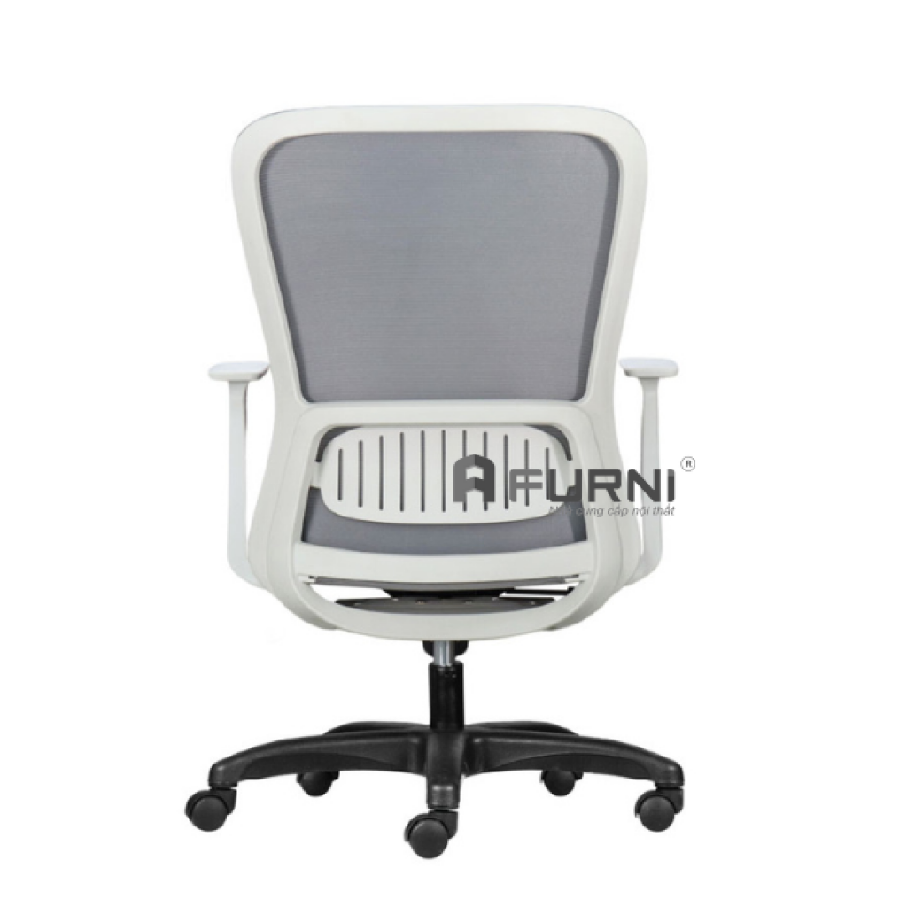 Chất liệu: Khung nhựa trắng, tay nhựa chữ T màu trắng, lưng lưới, nệm vải lưới, chân thép mạ chrome đầu nhọn, có bánh xe